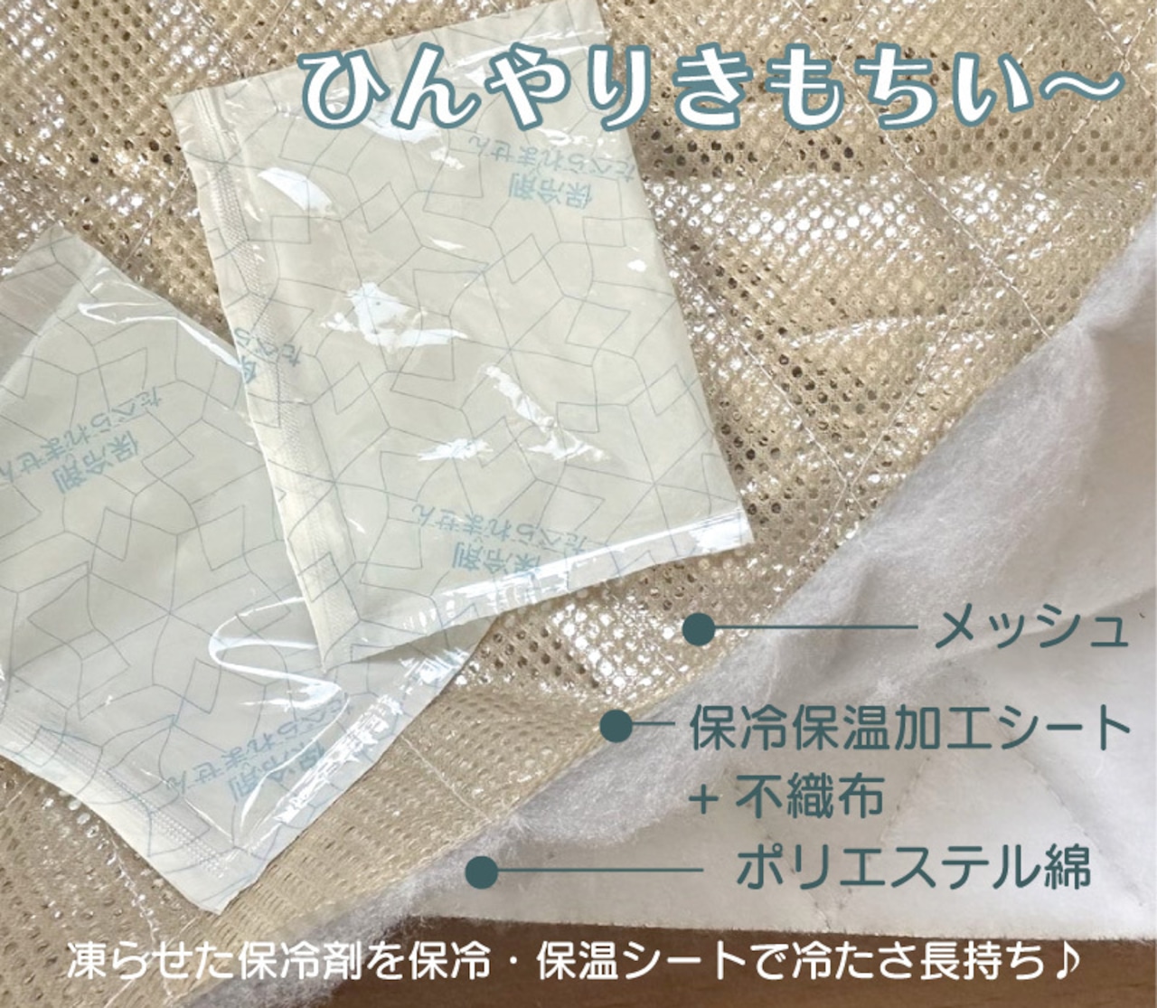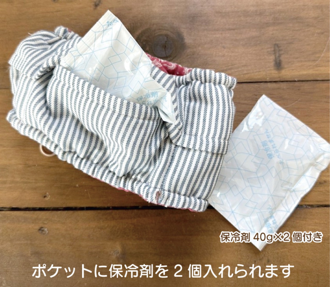ポケット部分は冷たさが長持ちするよう、中綿入り保冷シートを使用し凍らせた保冷剤が溶けにくくなっています!