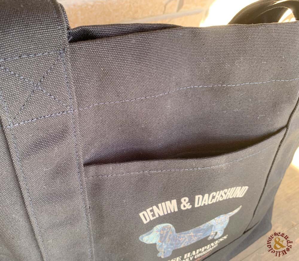 デニムシルエットのダックスフントマークにポケットがたくさんついた